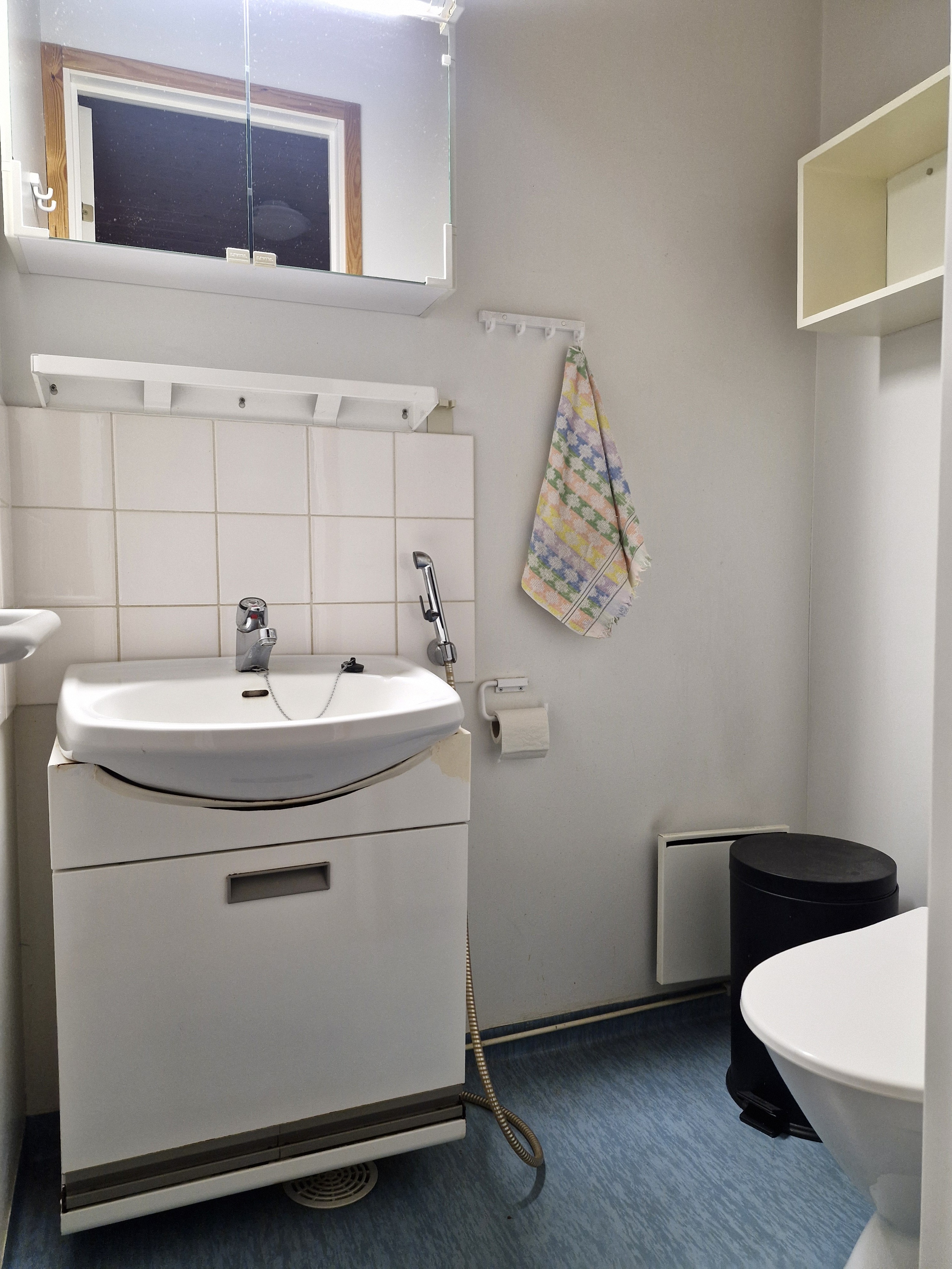 Varusteet: lattiaan asennettu WC, bidee, peilikaappi