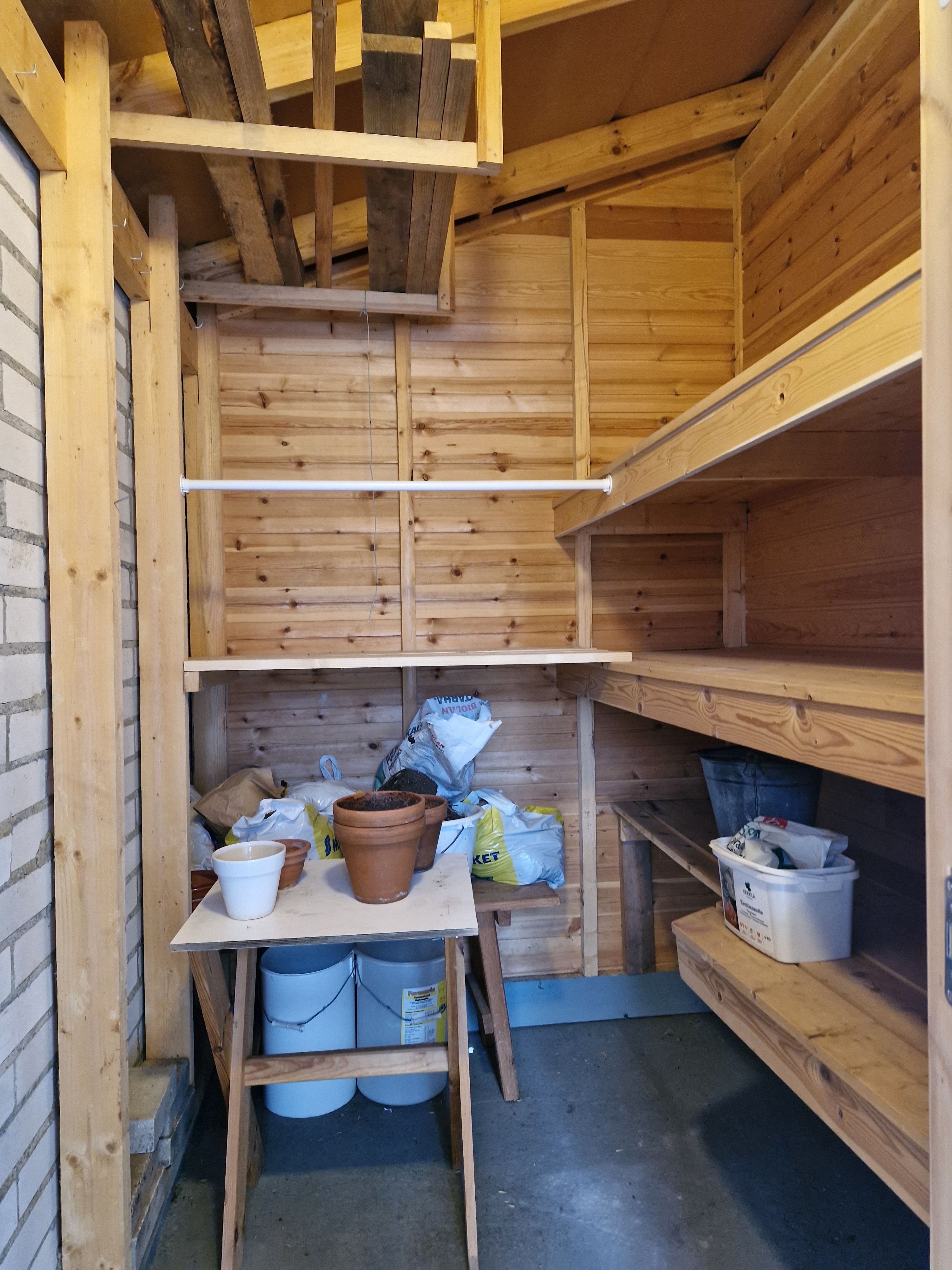 Kaksi ulkovarastoa, etu- ja takapihalla. Yhtiöjärjestyksen ja isännöitsijäntodistuksen mukaan osakkeet oikeuttavat 6 m²:n ulkovaraston hallintaan.