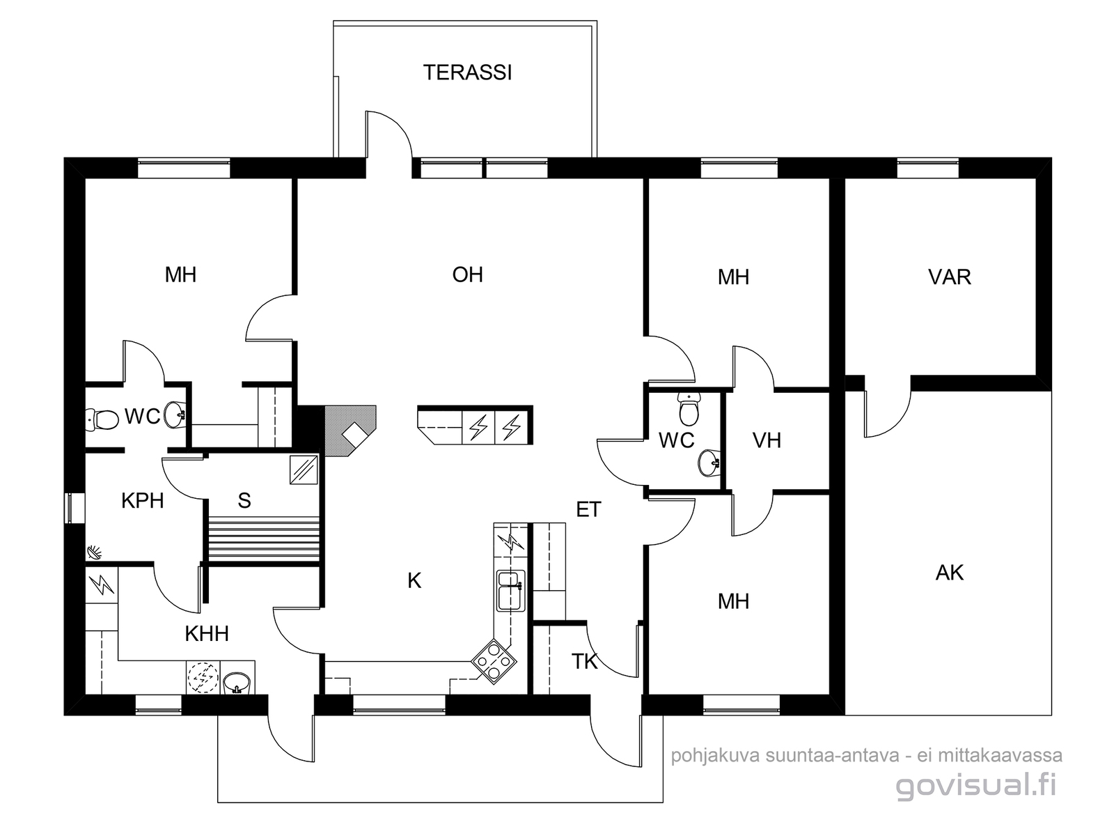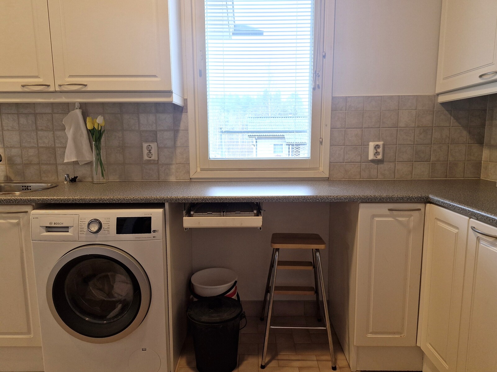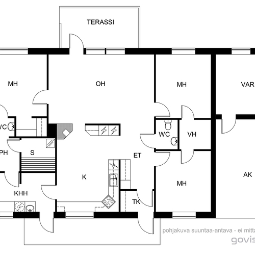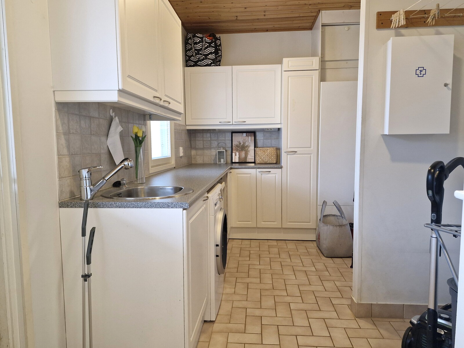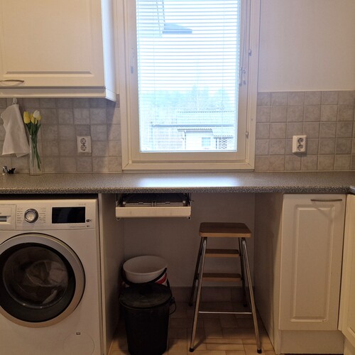 Varusteet: uloskäynti, lattiakaivo, silityspöytä/taso, pesuallas, pöytätaso, lattialämmitys, pesukoneliitäntä, keskuspölynimuri