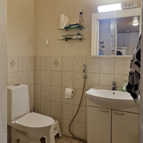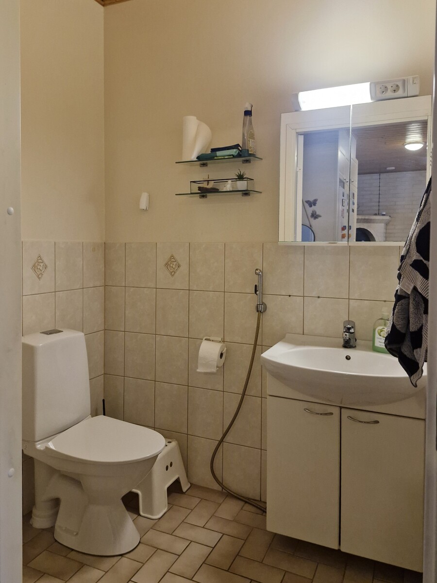 Varusteet: lattiaan asennettu WC, lattialämmitys, peilikaappi, allaskaappi