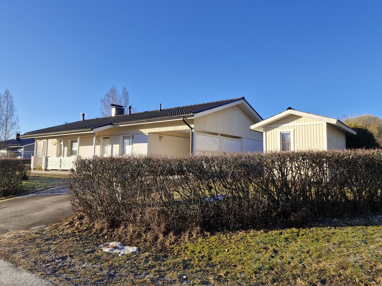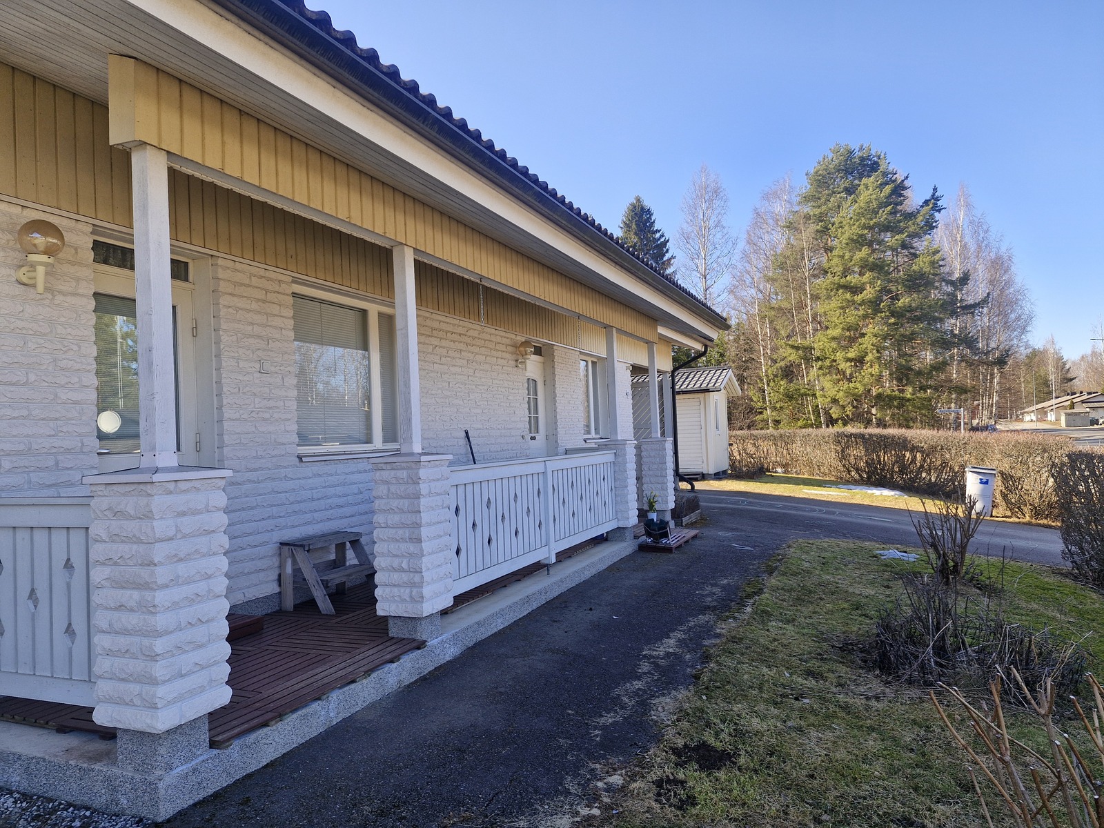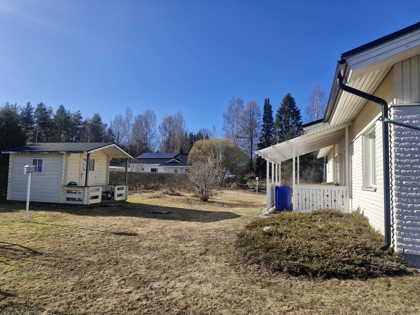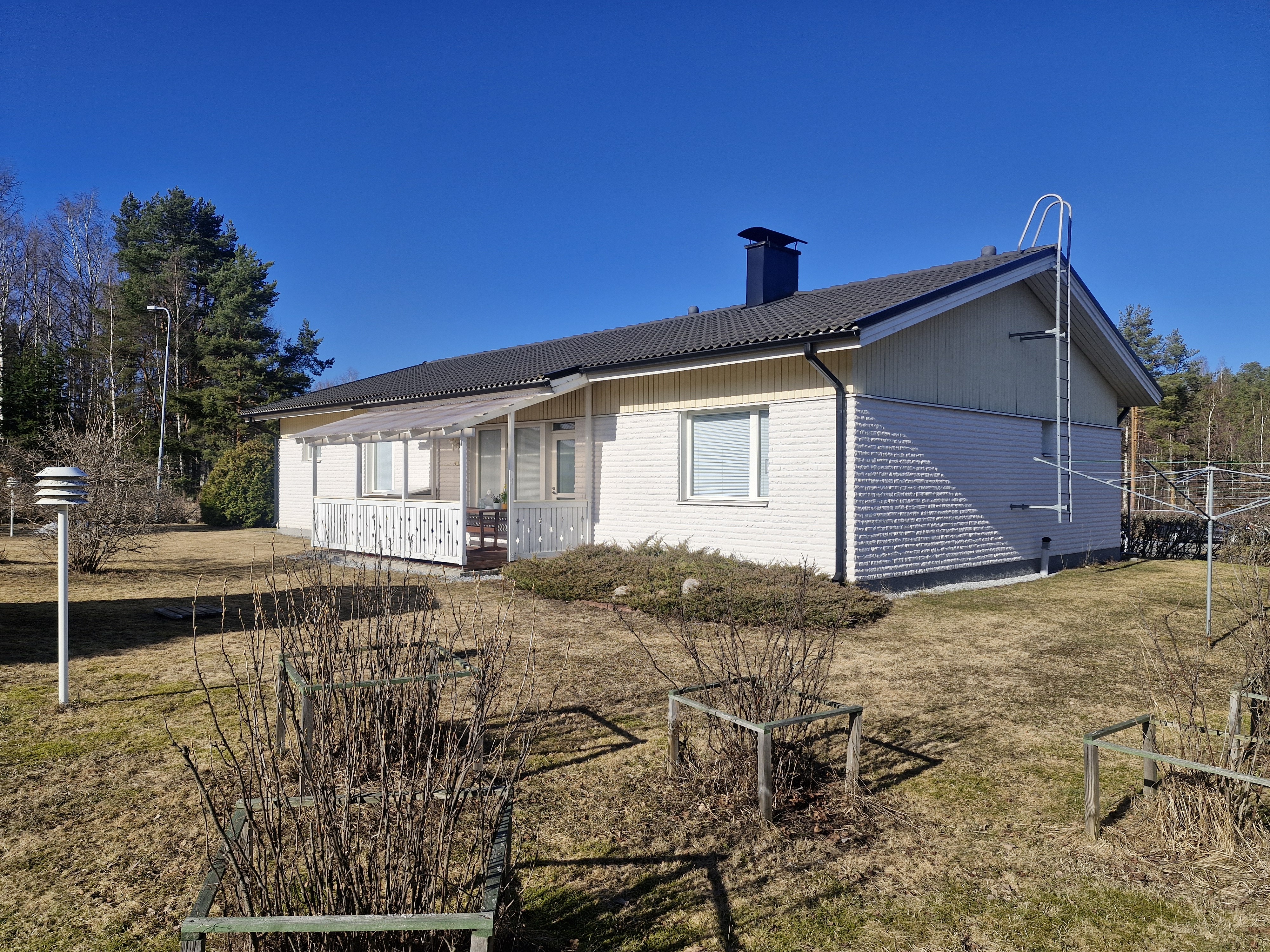 Olohuoneesta on käynti katetulle terassille ja puutarhaan, jossa kasvaa musta- ja punaherukkapensaita sekä karviaisia. Talon sivustalla on lisäksi kirsikkapuu. Tonttia ympäröi hoidettu aroniapensasaita. Erillisiä piharakennuksia löytyy puuliiteri ja leikkimökki.