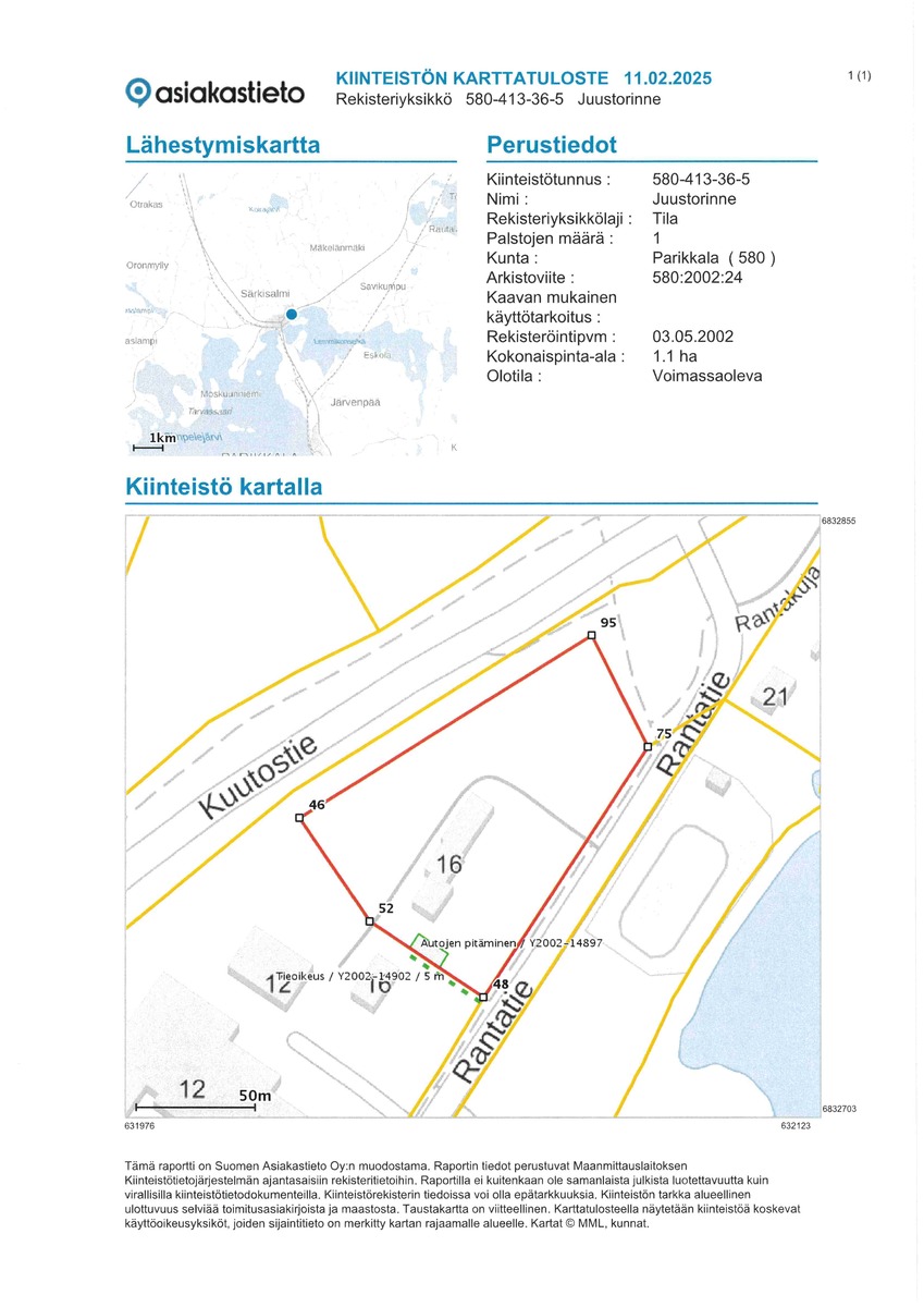 Rivitalon kellarikerroksesta löytyy mm. saunatilat, pesutupa, runsaasti varastotiloja, tekninen tila ja autotalli. Käyttövesiputkistot ja lämpölinjat on uusittu v. 2000, ulko-ovet ja ikkunat v. 2011. Rakennuksen kuntotarkastus tehty syyskuussa 2024, raportti ja lisätietoja saatavana välittäjältä. Tontin pinta-ala 1,10 ha, pääosin nurmialuetta.