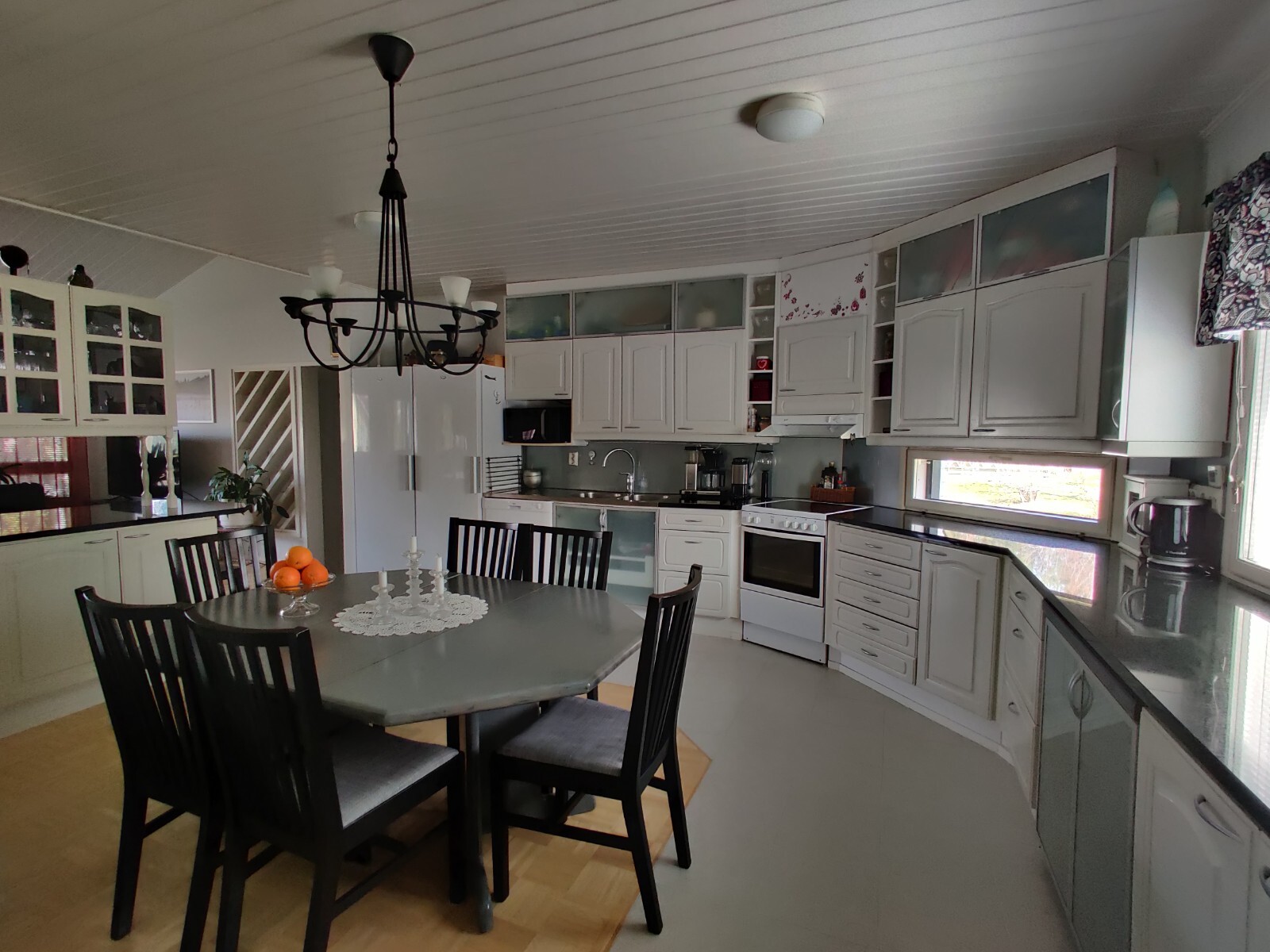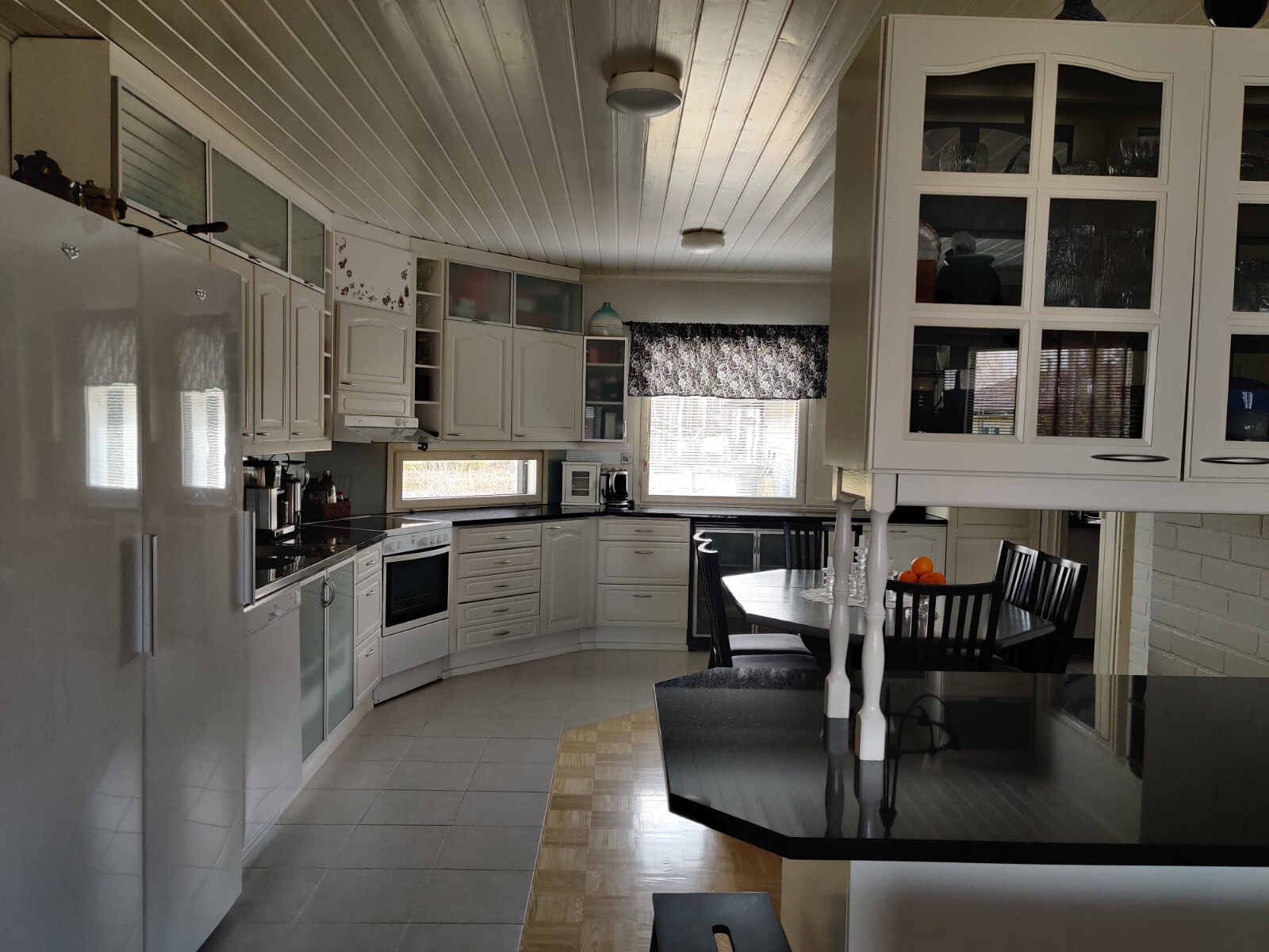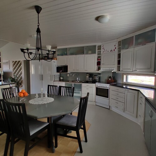 Varusteet: jääkaappi, pakastin, keraaminen liesi, astianpesukone, liesituuletin hormilla