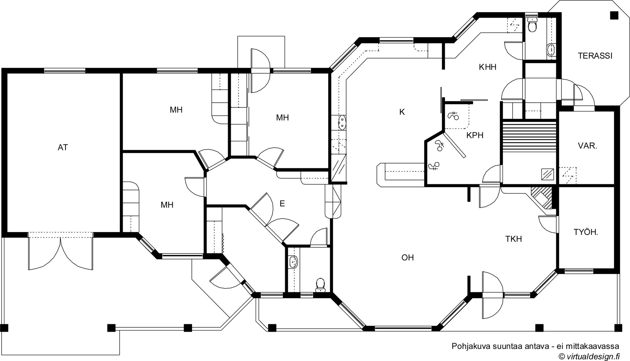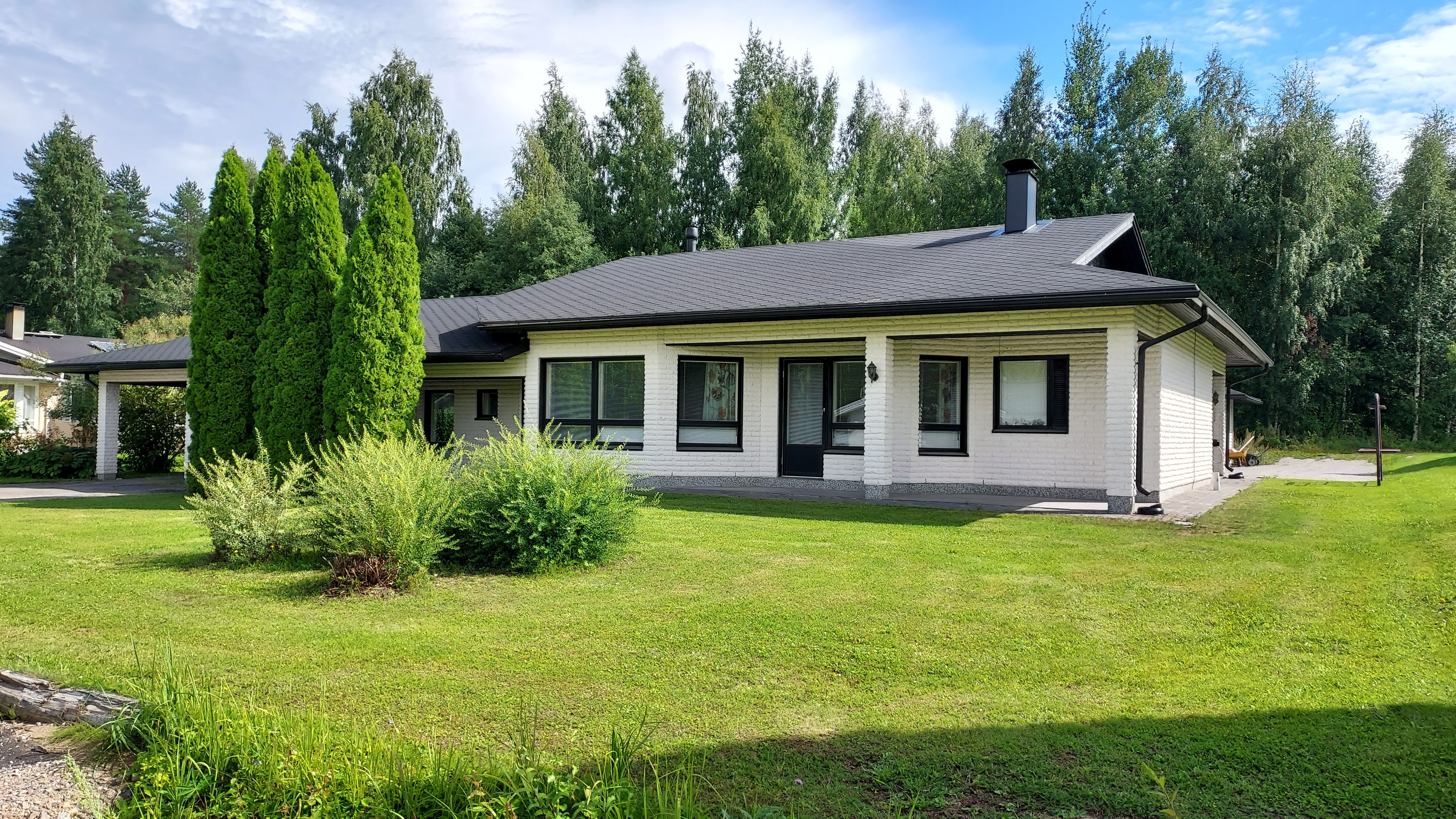 Tasokkaista materiaaleista rakennetun v. 1994 valmistuneen kodin tilat kestävät aikaa. Asuintilat on sijoitettu kahteen tasoon. Ylemmässä osassa on avara olohuone, johon yhdistyvät takkahuone ja keittiö, kodinhoitohuone, wc, kuraeteinen, kylpyhuone ja sauna sekä lämmin varasto. Alempaan tasoon on sijoitettu kolme makuuhuonetta, eteinen ja aula sekä wc. Pääsisäänkäynnin lisäksi yhdestä makuuhuoneesta, takkahuoneesta ja kuraeteisestä on käynti ulos. Kaikissa asuintiloissa on lattia- ja kattolämmitys, lisänä vuolukivitakka ja ilmalämpöpumppu. Talossa on eristetty autotalli, johon voi asentaa vesipisteen. Takapihalla erillinen talousrakennus. Kiinteistöllä on BLC:n valokuituyhteys valmiina.