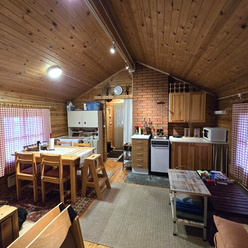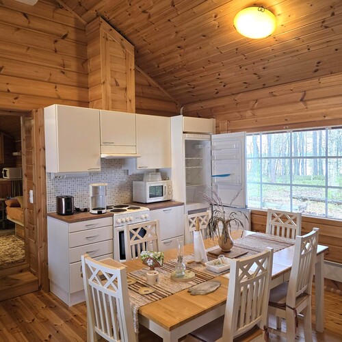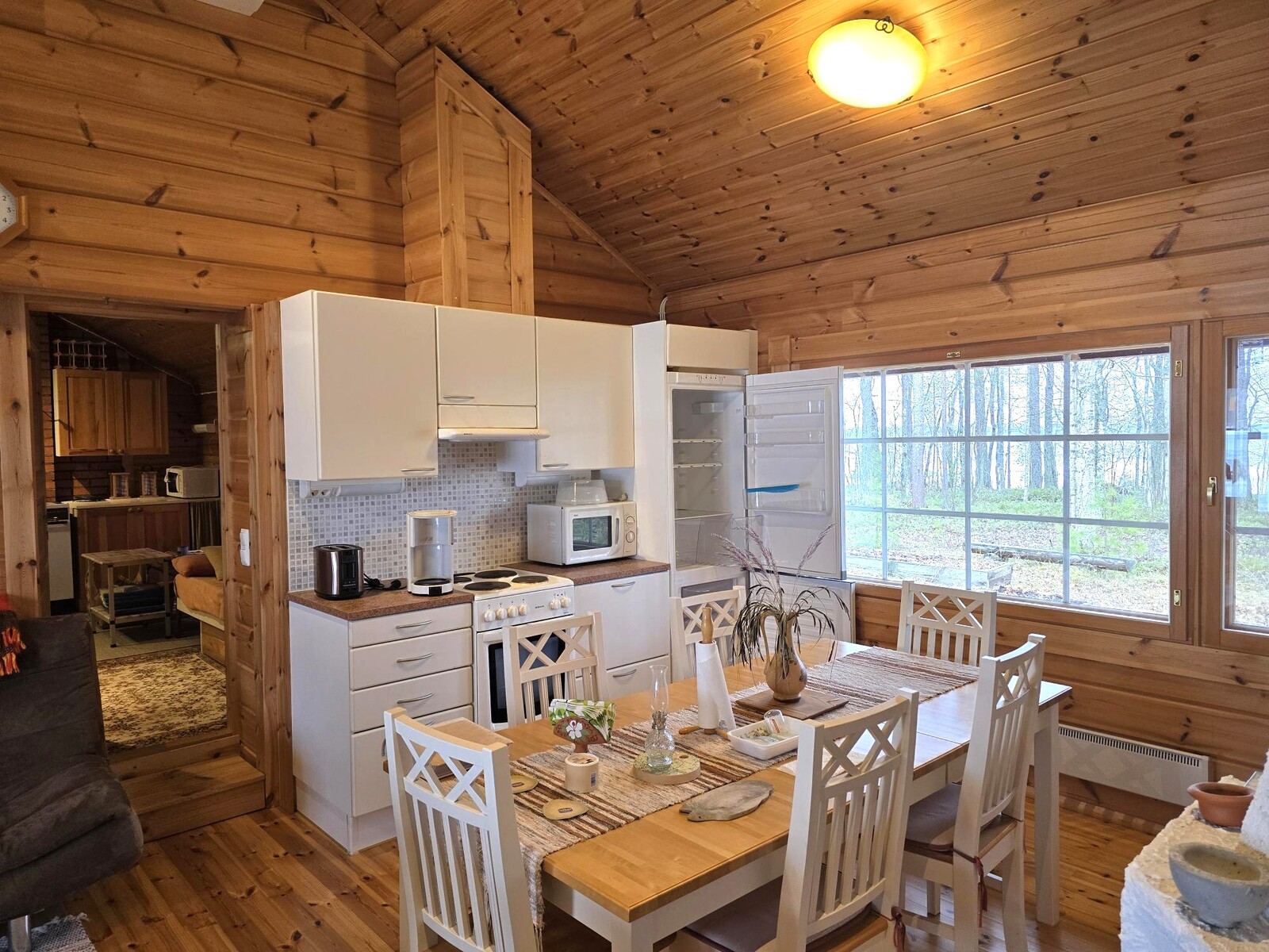 Varsinainen keittiö laajennusosassa. Pieni keittiönurkkaus alkuperäisessä osassa, jonka varusteina kamiina, keittiönkaapistot ja mikro.