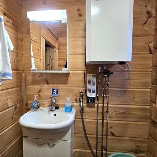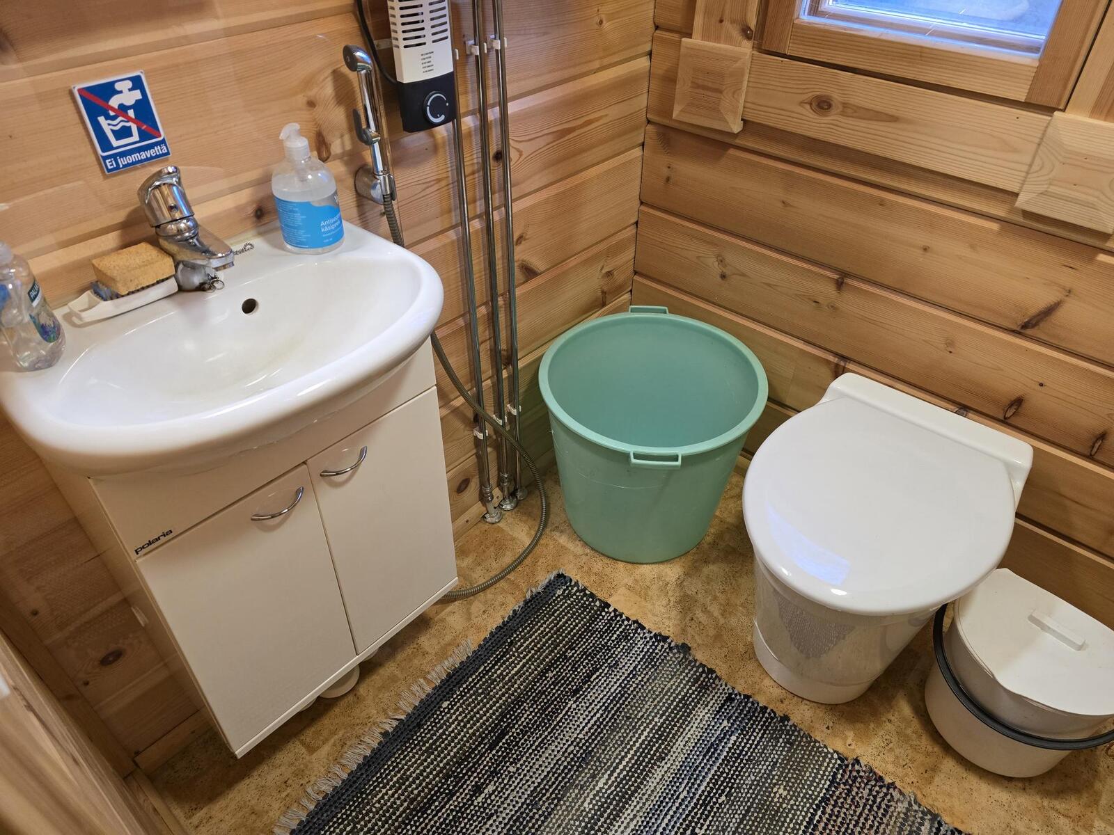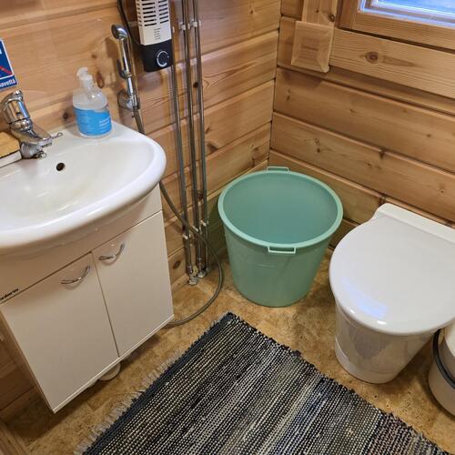 Käytössä järvivesi. Laiturin päässä karkeasuodatin, josta putki talon vieressä olevalle pumpulle. Pumpun jälkeen Watman-patruunarunko, jossa vaihdettava suodatin. Juomavesi tuotu mukana.