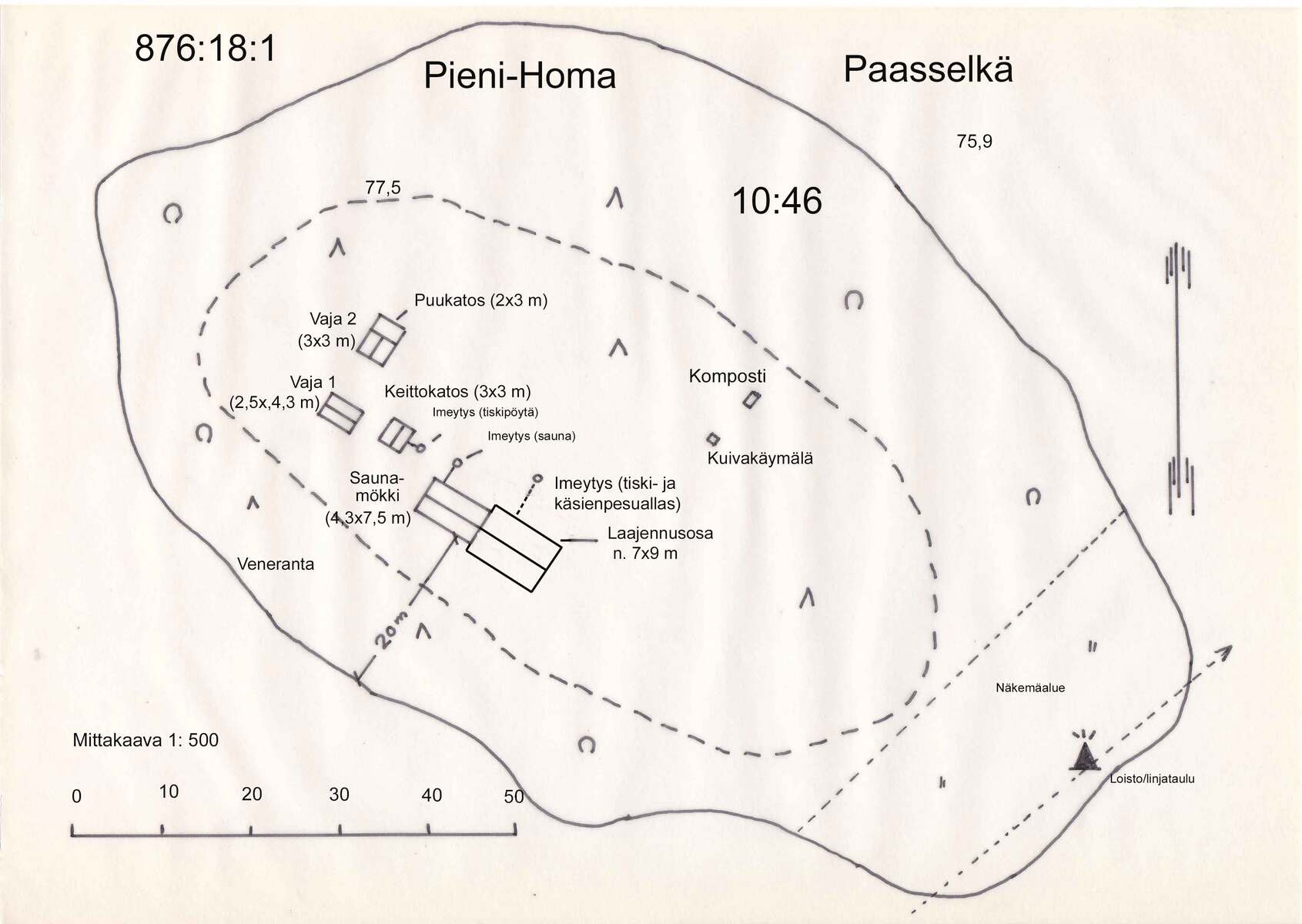 Pieni-Homa -saarella sijaitsee v. 1990 rakennettu ja v. 2006 laajennettu Honkarakenteen höylähirsinen vapaa-ajanasunto. Alkuperäisessä osassa on tupa keittiönurkkauksineen, sauna ja eteinen sekä nukkumaparvi. Laajennusosassa olohuone, keittiö, makuuhuone, eteinen, lasitettu kuisti ja Ekolet- kompostikäymälä. Pihapiiristä löytyy kaksi vajarakennusta, puucee, keittokatos, jossa muuripata sekä hella ja tiskipöytä. Ranta on kovapohjainen hiekkaranta, joka avautuu aurinkoisesti lounaaseen ja etelään. Saaren puusto on pääosin mäntyvaltaista.