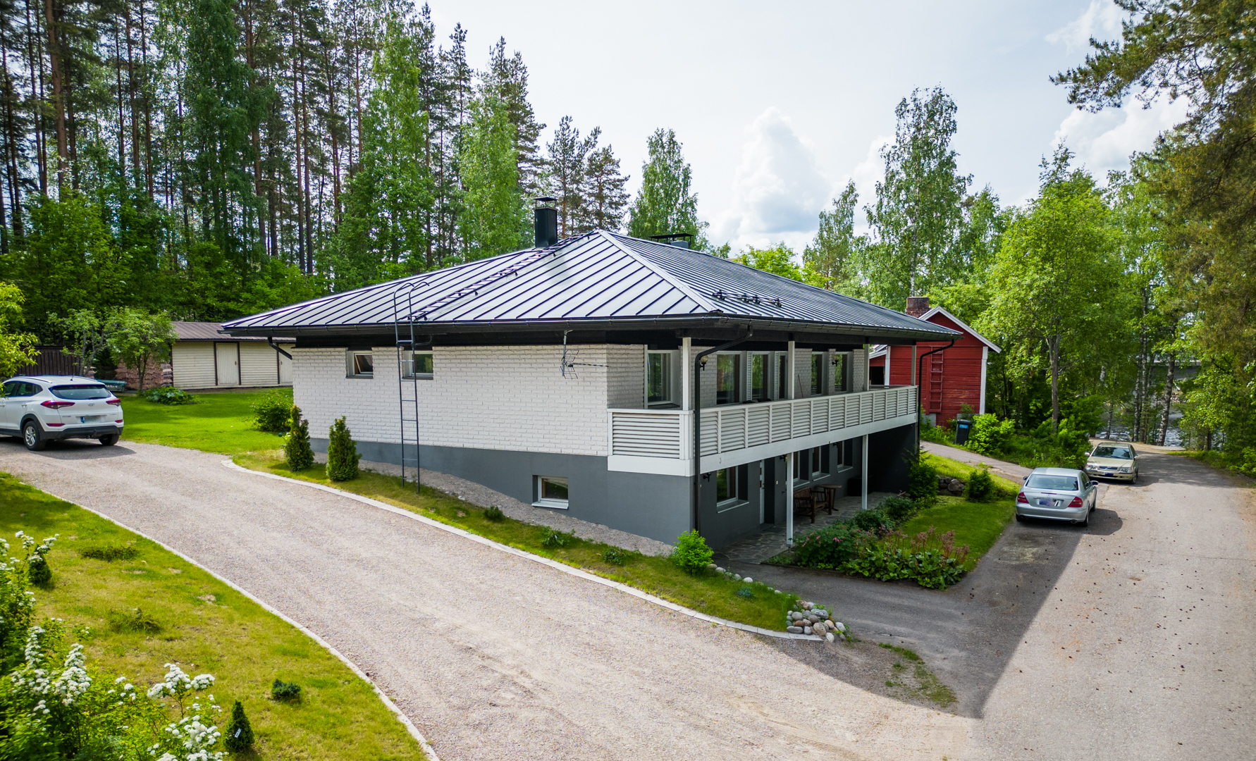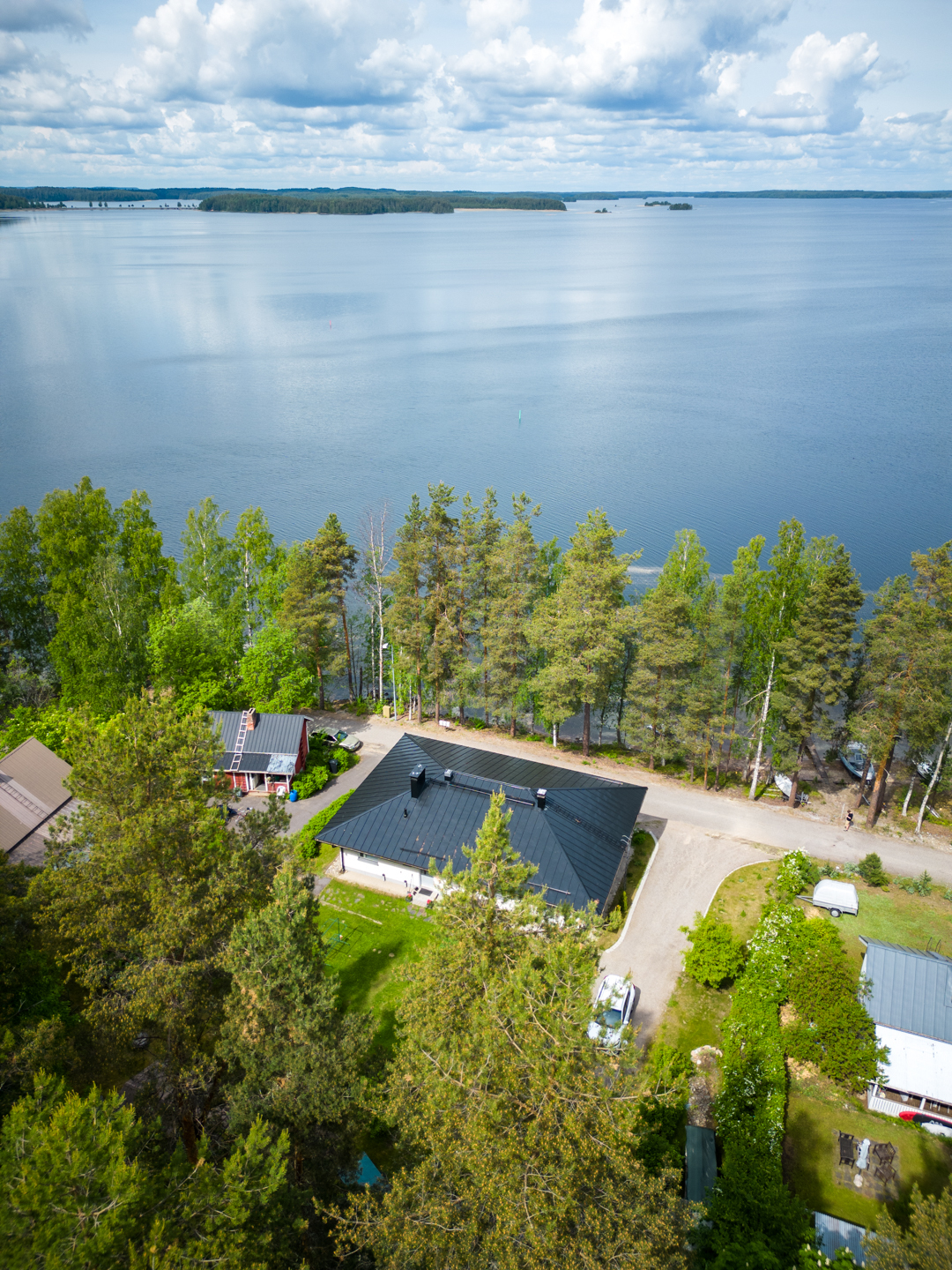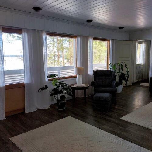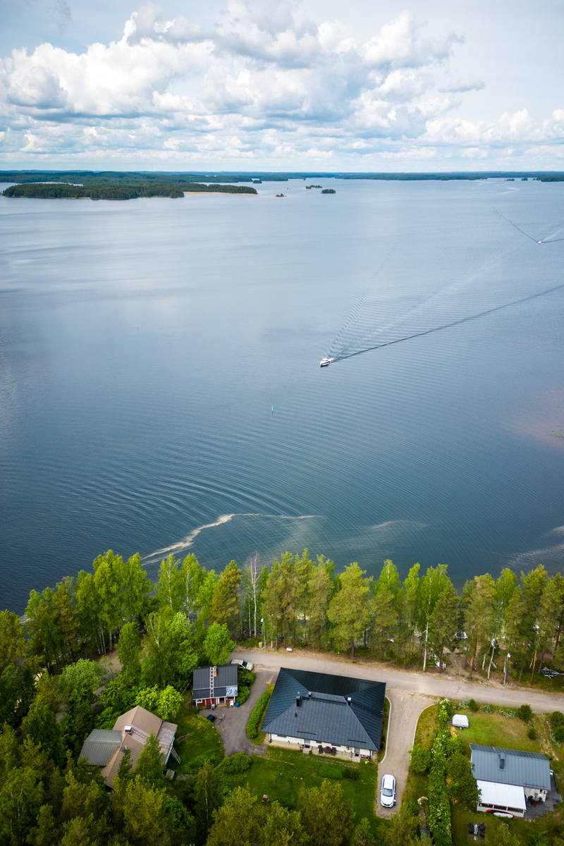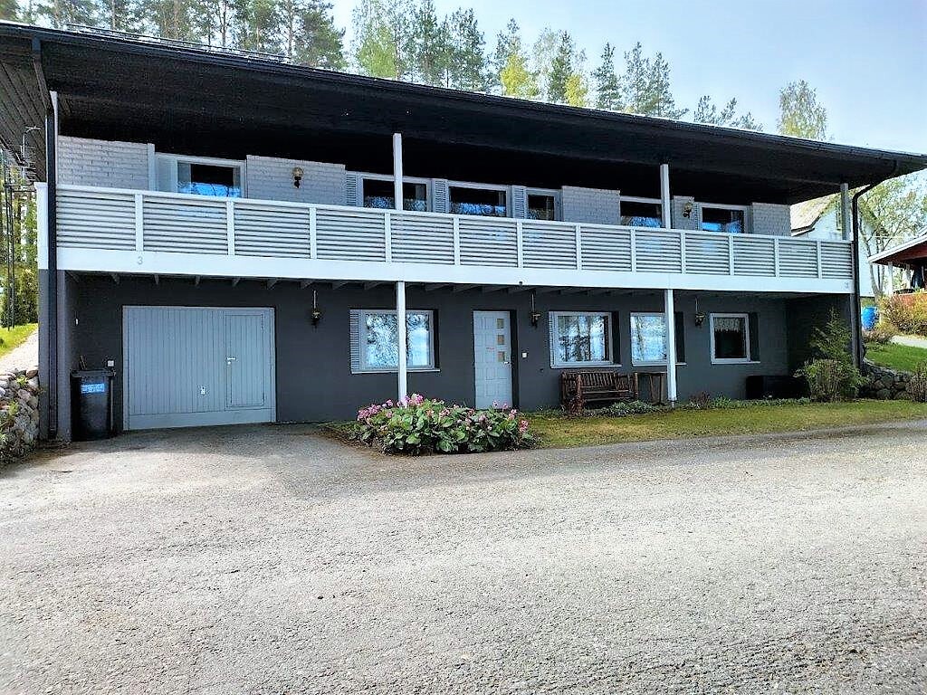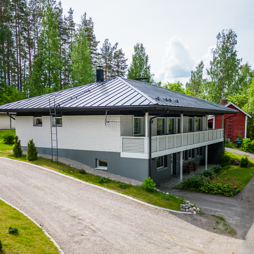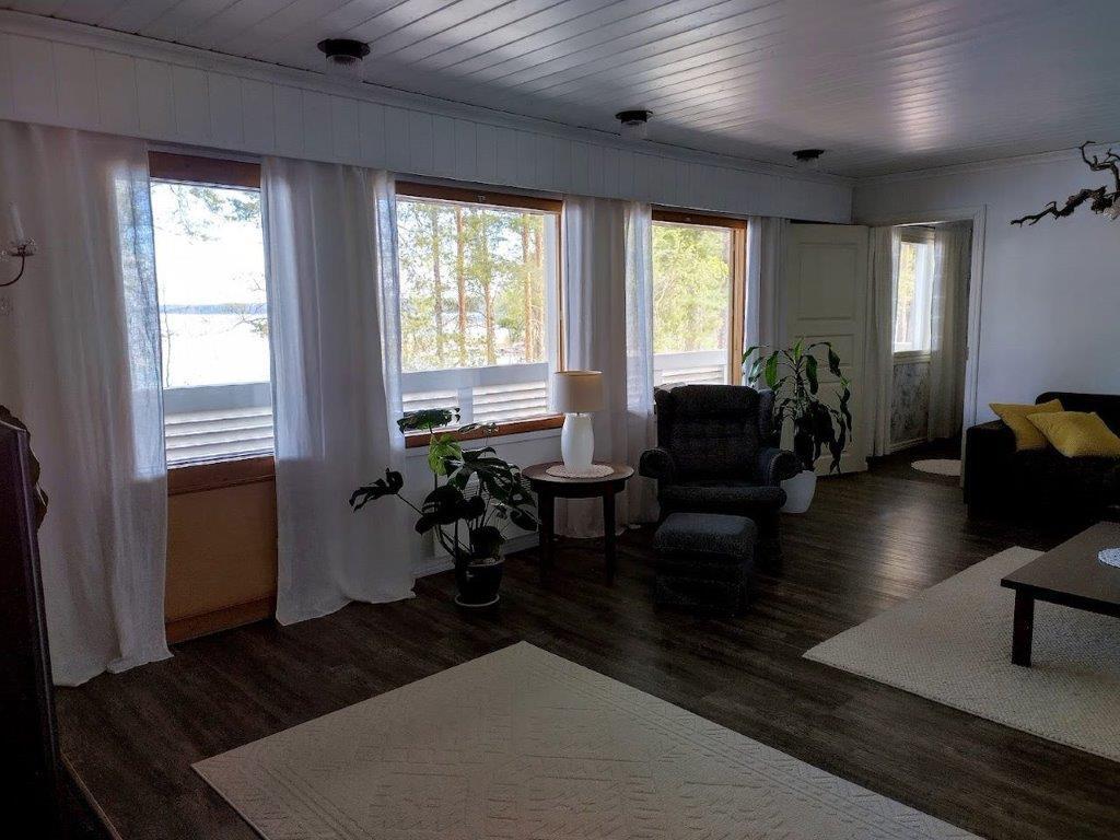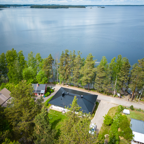 Talossa on tilaa asua, yrittää, harrastaa, tilaa on isolle perheelle tai vaikka kahdelle, mahdollisuuksia on paljon. Yläkerrassa on olohuone, keittiö, 3 makuuhuonetta ja koko talon levyinen parveke upein järvinäköaloin, alakerrassa olohuone, avokeittiö, 2 makuuhuonetta, kodinhoitohuone ja saunaosasto. Kerroksia yhdistää tukeva portaikko, molemmissa kerroksissa on myös omat sisäänkäynnit. Säilytys- ja varastotiloja on runsaasti sekä talossa että piharakennuksessa.