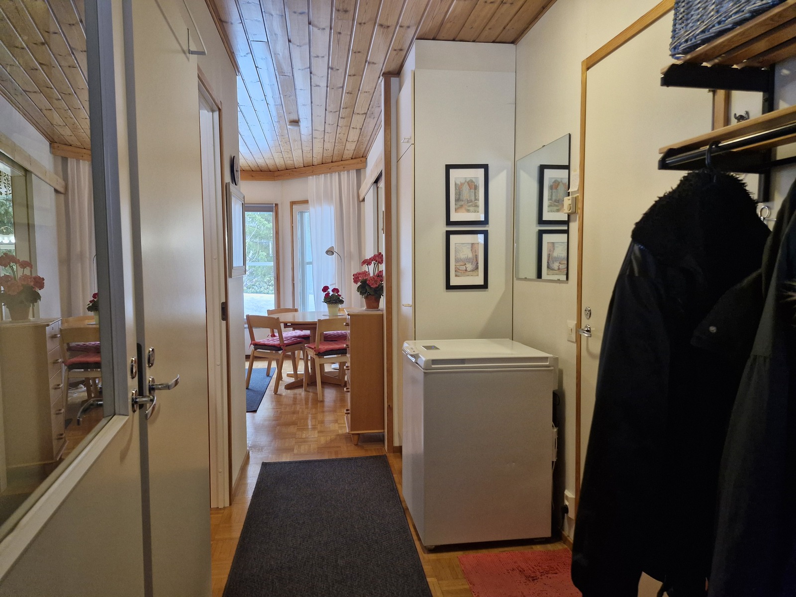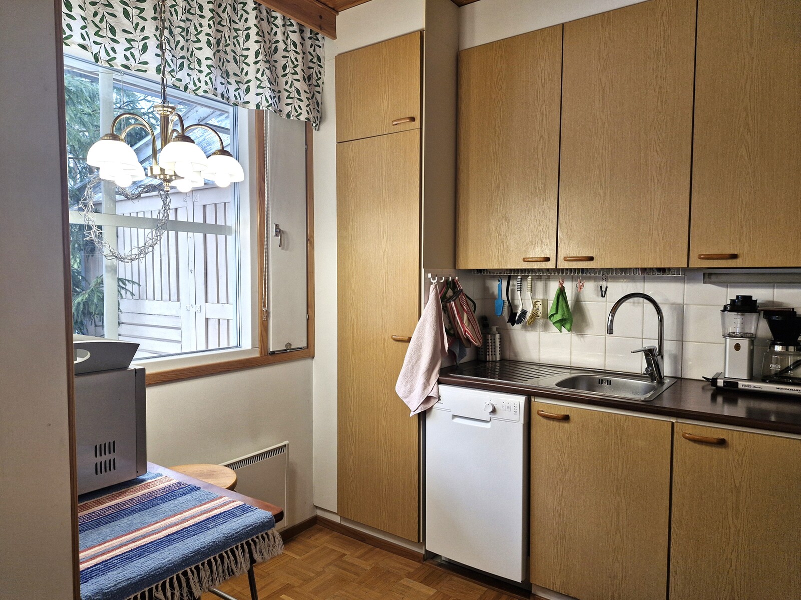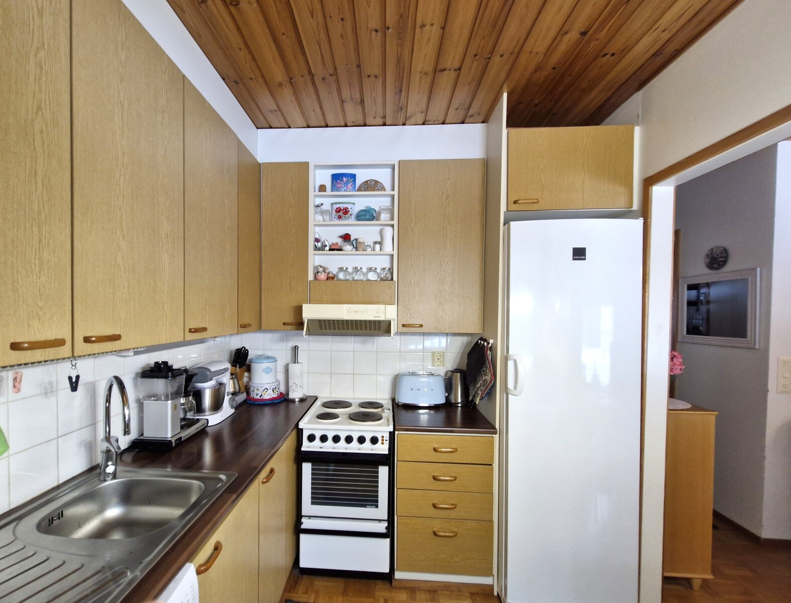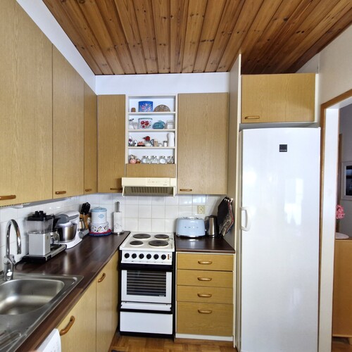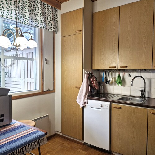 Varusteet: sähköliesi, liesituuletin hormilla, astianpesukone, jääkaappi